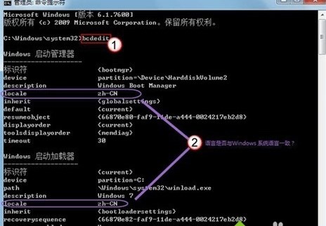 4、在命令窗口中鍵入bcdedit,然后按一下回車(chē)鍵。檢查一下Windows啟動(dòng)管理器和Windows啟動(dòng)加載器下locale對(duì)應(yīng)的語(yǔ)言是否與Windows 7系統(tǒng)語(yǔ)言一致;