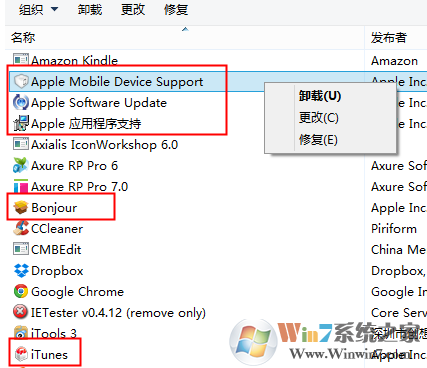 首先,關閉iTunes,然后進入電腦的卸載程序(以Win7為例,是控制面板-程序-卸載程序),按照下面的順序,依次卸載:
