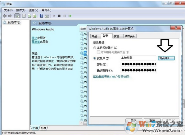 5、然后輸入:lo再點(diǎn)擊檢查名稱(chēng)按鈕,之后會(huì)搜索出來(lái)Local Service→確定→確定。然后,再去開(kāi)啟Windows Audio聲音服務(wù)即可。