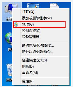1、將鼠標(biāo)移至桌面計(jì)算機(jī)圖標(biāo)上,然后單擊右鍵,在彈出的菜單中選擇“管理”,如下圖所示: