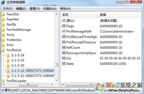 6.在ProfileList文件夾下,分別點(diǎn)擊名字為較長(zhǎng)的字符串的文件夾,查看窗口右側(cè)的ProfileImagePath鍵的內(nèi)容,找到路徑為C:\Users\A的鍵。