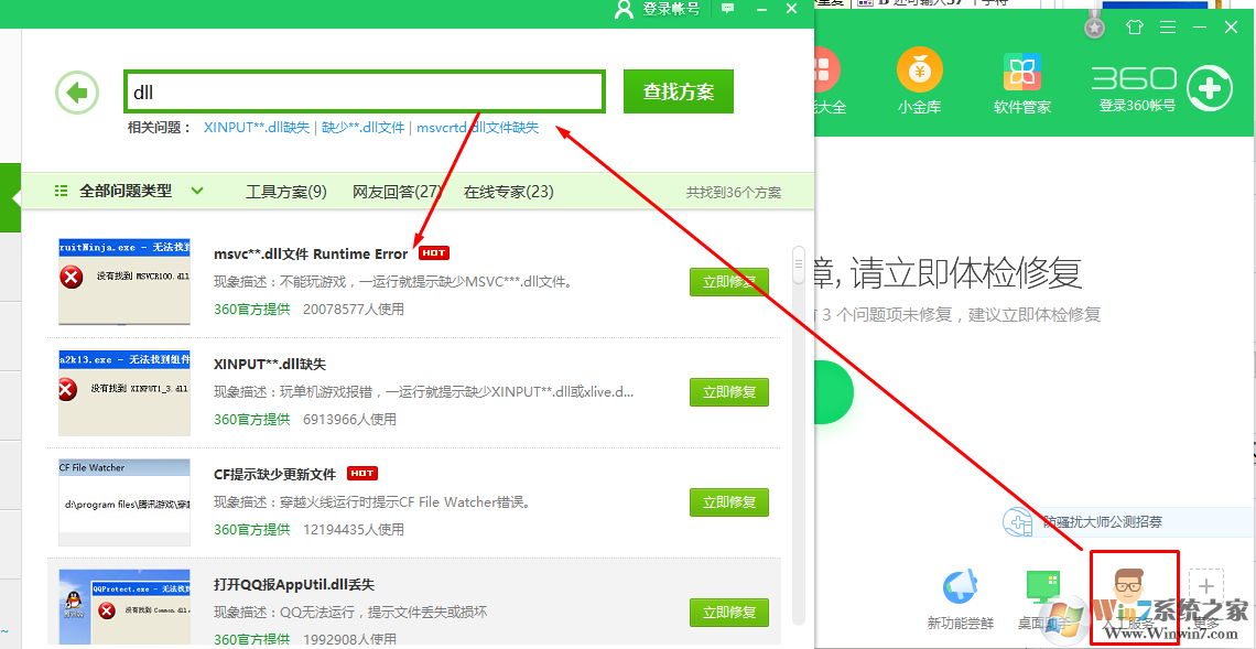 1、打開安全衛(wèi)士、選擇人工服務(wù)、搜索相應(yīng)丟失的dll,然后在下面的結(jié)果中直接點擊的立即修復(fù)即可。