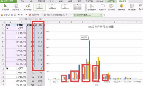 4、在我們剛剛做好的柱形圖上挑出我們自己要明顯標出的數(shù)據(jù),這樣以便我們做出不同的形圖來表達這組數(shù)據(jù),如圖,我這里就隨便選一組數(shù)據(jù)選20163月的
