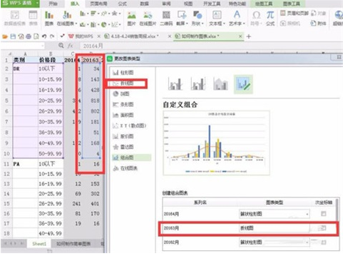 5、我在這里就選折線圖來呈現(xiàn)我們剛剛選的20163月的數(shù)據(jù)為第2種圖形,在原來柱形圖上選中數(shù)據(jù)右擊鼠標選更改圖表類型這一項將3月的改為折線圖,如圖所示