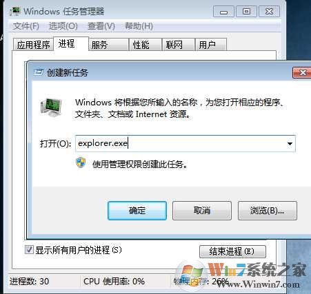 3、接下來,我們再點擊windows7任務(wù)管理器上的 文件—運行 輸入explorer.exe;