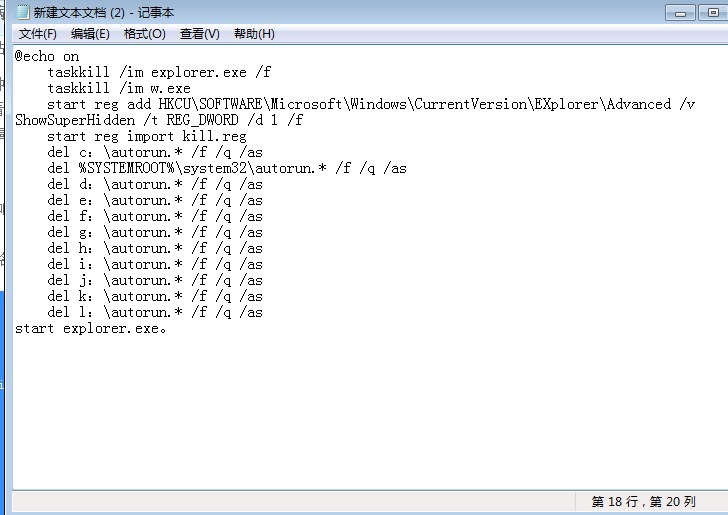 3、運行之前建立的bat文件,并雙擊運行。程序會自動搜索autorun病毒并且刪除。