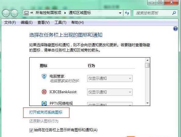 2、在通知區(qū)域圖標中,點擊“打開或關閉系統(tǒng)圖標”選項;