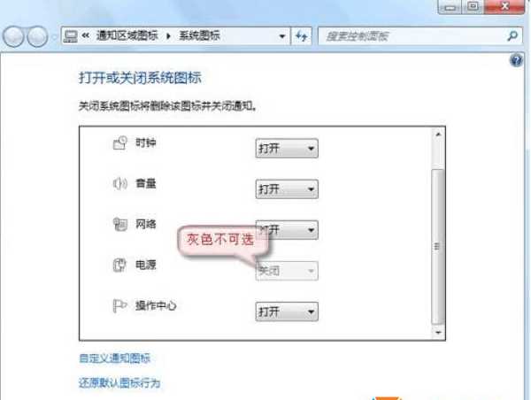 3、在系統(tǒng)圖標設置界面,我們找到“電源”設置為“打開”,然后確定保存即可,不過有些用戶打開后電源圖標打開設置是灰色的無法設置,如下圖: