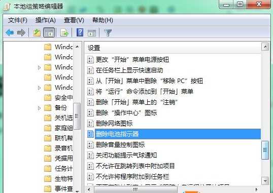 2、在右側(cè)窗口中找到“刪除電池指示器”選項,雙擊該選項然后設置為 未配置或已禁用,最后保存設置;