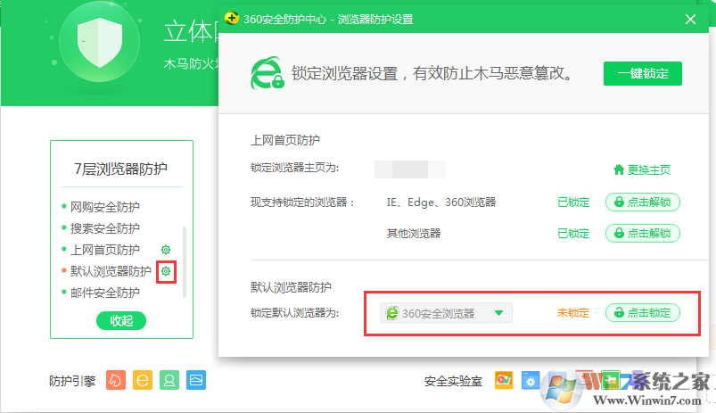 3、點(diǎn)擊默認(rèn)瀏覽器防護(hù),設(shè)置,然后鎖定默認(rèn)瀏覽器中選擇一個(gè)你需要的瀏覽器點(diǎn)擊鎖定就可以了。