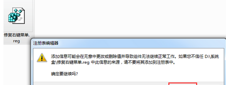 5、雙擊打開剛保存的“修復(fù)右鍵菜單.reg”,在彈出的警告窗內(nèi)點(diǎn)擊“是”即可。
