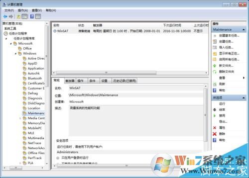 3、依次展開(kāi),Microsoft--Windows--Maintenance,在右側(cè)可以看到WinSAT,可以看到這里顯示的是每周執(zhí)行一次的
