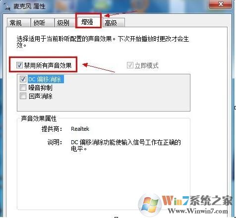2、切換到“麥克風(fēng)”標(biāo)簽,在“麥克風(fēng)效果”選項(xiàng)下選擇“噪音抑制”和“回聲消除”功能,同時(shí)調(diào)節(jié)麥克風(fēng)的音量等設(shè)置。