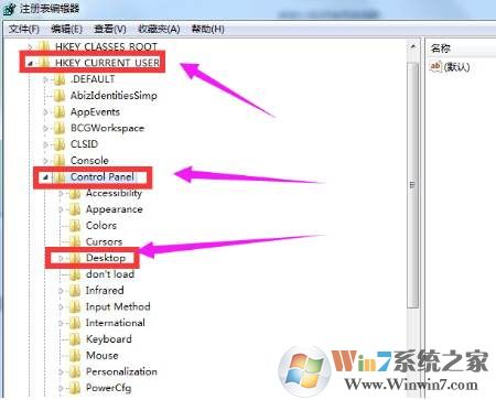 2、在注冊(cè)表編輯器頁(yè)面展開(kāi)到“HKEY_CURRENT_USER/Control panel/Desktop”。
