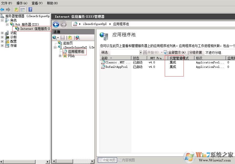 2.將應(yīng)用程序池中的內(nèi)容改為“集成”