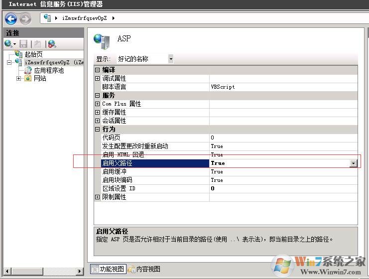 3、打開“服務(wù)器管理器”,雙擊“ASP”,“啟用父路徑”置為true,點(diǎn)擊右側(cè)的“應(yīng)用”