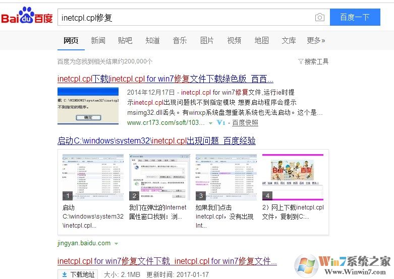 到百度搜索一下inetcpl.cpl for win7修復文件,下載并安裝進行修復,這樣就能解決問題了