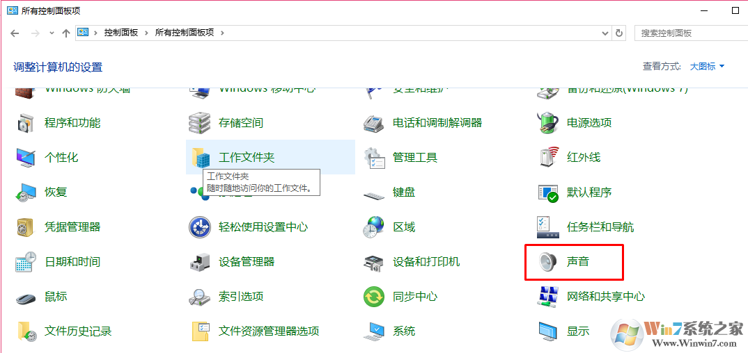 一、先在Win7桌面左下角處的“開(kāi)始”菜單中,打開(kāi)“控制面板”,然后在進(jìn)入到控制面板界面中,選擇小圖標(biāo)為查看方式,再選擇“聲音”項(xiàng)。