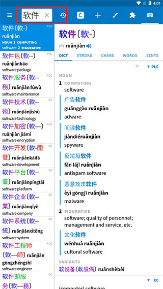 Pleco全面支持簡繁漢字,詞目發(fā)音可顯示注音和拼音,甚至還支持粵語。