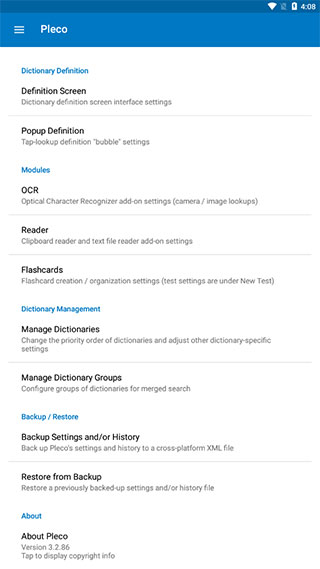 6、pleco目前還支持中文操作界面的切換,但是基本的功能普通用戶肯能夠看懂,如果實(shí)在不懂,就用軟件自行搜索一下,也可以解決。