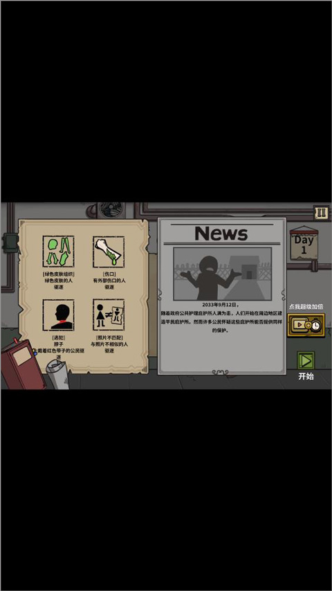 3、玩家在游戲中要仔細(xì)觀察來到庇護(hù)所的所有人,準(zhǔn)確查找到不對(duì)勁的人才能完成目標(biāo)開始下一關(guān)。