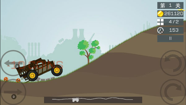 1、玩法:總體來(lái)說(shuō),還是比較簡(jiǎn)單的,與一般的登山賽車游戲玩法相仿,通過(guò)操控前進(jìn)、后退和調(diào)整向前、向后的中心來(lái)把控汽車的平穩(wěn)運(yùn)行。