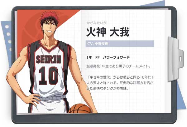從美國回到日本的他與第一主人公黑子哲也是搭檔關系,是與命運之影相遇的真正的光,同時也是誠凜高校的新生王牌。