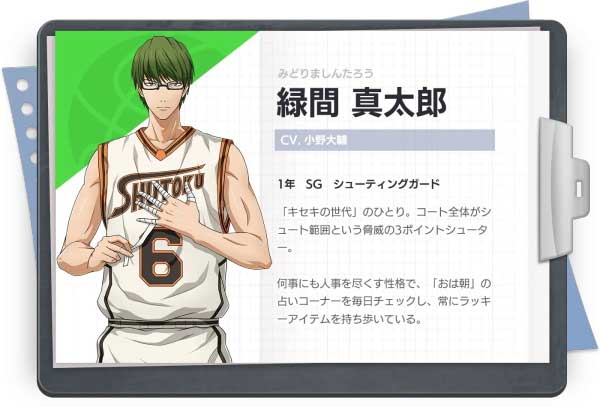 現(xiàn)屬秀德高校一年級的王牌選手,原帝光中學籃球部「奇跡的世代」五人中的一人,左手總纏著繃帶。 很相信晨間占卜,被人們稱為“三分神射手”,曾擔任帝光中學籃球部副隊長。