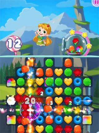 在消除玩法上拋棄傳統(tǒng)的指尖滑來(lái)滑去的單純玩法,融入了許多策略元素和軍旗的規(guī)則,如果你只是考慮當(dāng)前步奏,可能在規(guī)定的步奏之內(nèi),是很難消除夠規(guī)定的糖果數(shù)。而當(dāng)你劃一步能顧及到后面一步或幾步的話,就很有可能出現(xiàn)連消或大面積消除的激情場(chǎng)面,完成目標(biāo)通過(guò)關(guān)卡,是很輕松的