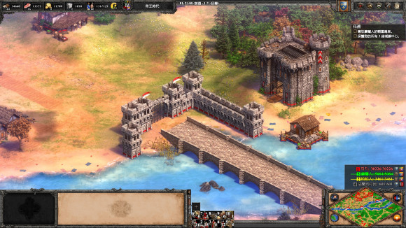 3、 建城墻把三座橋封死, 然后升城堡時代到9點中的淺灘造兩座城堡, 發(fā)育一段時間后就可以反攻了。 兩個敵人都沒什么守軍, 城堡時代就可將迦菲奇殺死, 然后攻克摩爾人的陣地, 把車領(lǐng)出來, 送回家過關(guān)。