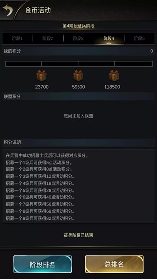 殺敵階段周五開啟,持續(xù)三天,周日結束。積分來源于擊殺不同的士兵,對方士兵等級越高,自身獲得的積分則越高。前四個階段都是為了第五階段做準備,相信前面已經獲得靠前名次的領主在這一階段也不會太差。