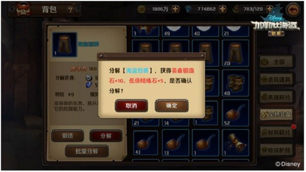 在背包中選擇分解裝備可獲得裝備強(qiáng)化所需道具,分解的道具獲得量與裝備精煉、強(qiáng)化等級(jí)成正比。