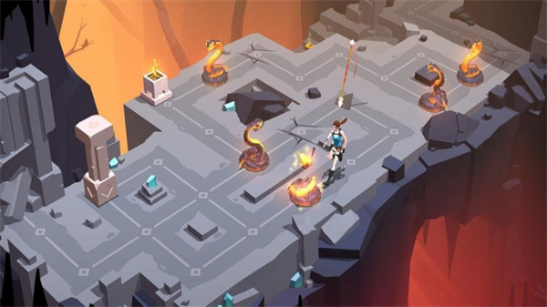 場(chǎng)景三的挑戰(zhàn)依然在等待著我們,勞拉來(lái)到第一個(gè)小平臺(tái)上時(shí)巨蟒就會(huì)發(fā)動(dòng)攻擊,我們需要向下方躲避一下登上最上方的高臺(tái)處。爬上高臺(tái)的一瞬間會(huì)吸引蜥蜴的仇恨,我們帶著蜥蜴兜個(gè)小圈子并將立柱向外拖動(dòng)一格。此時(shí)蜥蜴因?yàn)榱⒅淖钃醵ノ搽S目標(biāo),我們可以趁機(jī)擊殺掉它。接著我們將立柱推到下方空缺著的路口處,搭建一個(gè)臨時(shí)的行進(jìn)平臺(tái)。跳下高臺(tái)后再躲避巨蟒的一次攻擊,即可順利來(lái)到畫面的右方。