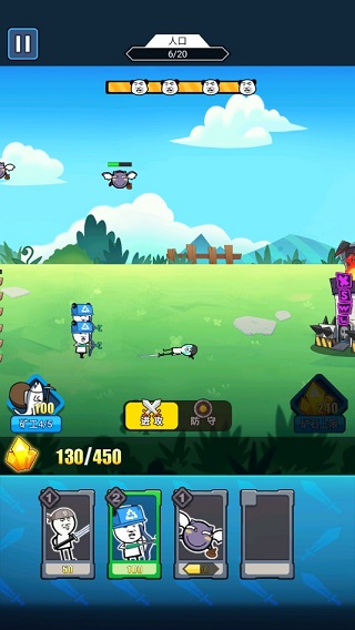 從游戲的名字中就可以知道這是一款魔性的玩梗游戲,在玩梗的基礎(chǔ)上其實(shí)玩法做的也不差。游戲中玩家需要操控礦工去挖礦,將礦物用來養(yǎng)兵,利用養(yǎng)出來的兵防守或者進(jìn)攻,直到摧毀敵方的防御塔為勝利,己方防御塔被摧毀則失敗。首先,個(gè)人認(rèn)為游戲的一大亮點(diǎn)就是這個(gè)兵種搭配了。游戲中的兵種其實(shí)還算得上不少,靈活搭配說不定會(huì)有出奇的效果。