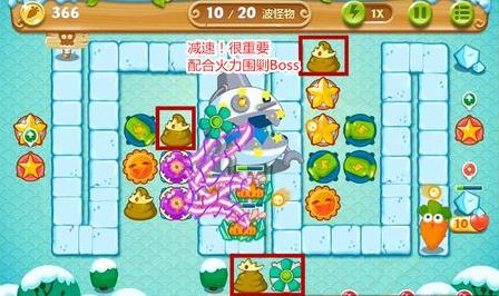 4、等右半場(chǎng)火力布置差不多的時(shí)候,鐵皮也走進(jìn)右半場(chǎng)的攻擊范圍,這是整個(gè)戰(zhàn)斗的關(guān)鍵,玩家要讓鐵皮在這段路走的時(shí)間越長(zhǎng)則越好,此時(shí)減速就變得很重要。減速風(fēng)扇、便便炮塔,玩家快要在圖中方框的地方放上,可以保證鐵皮一直處于減速狀態(tài)!