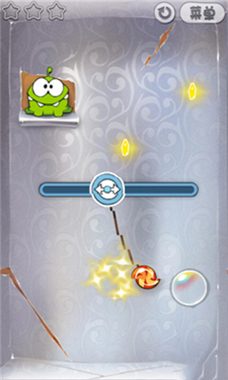 6、滑塊,滑塊可以在滑道中上下或左右移動(dòng)。有時(shí)候需要迅速移動(dòng)來使糖果搖擺幅度變大,用來獲得一些星星,還能把繩子拉緊。