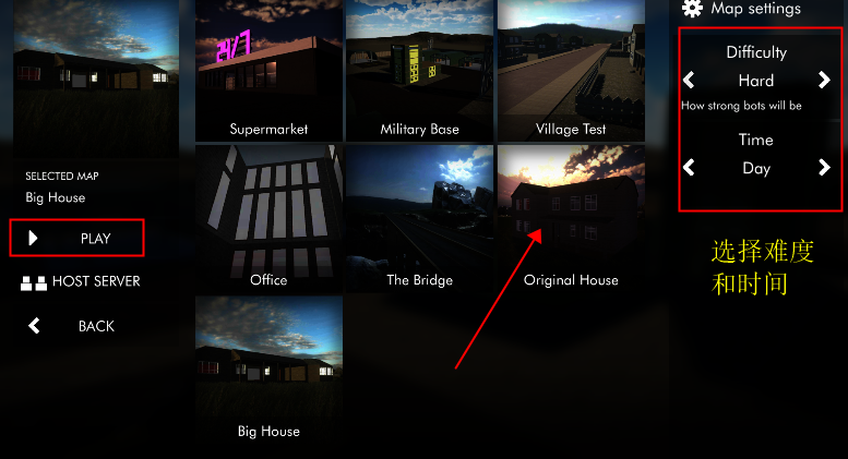 3、右上角選擇游戲難度和游戲時間,中間選擇一個地圖,然后點擊左邊play開始游戲。