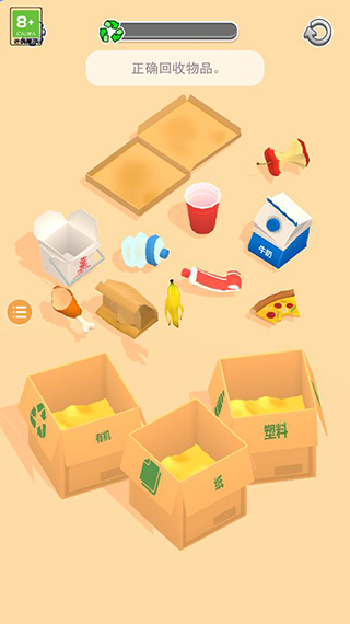 5、注意看關(guān)卡的要求,比如這里是正確回收物品,只要將物品正確放置收納盒中即可通關(guān);