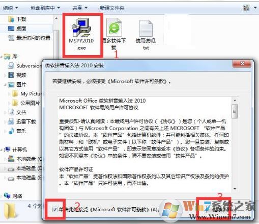 1、在winwin7站點中下載微軟拼音輸入法安裝包,雙擊打開運行程序,在出現(xiàn)的新界面中點擊接受協(xié)議,點擊繼續(xù)