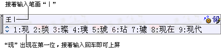 | 部件選取的順序以漢字筆順為準(zhǔn),即按筆畫輸入到有部件時(shí)就進(jìn)行部件的輸入。 如:"現(xiàn)"字,"王"為一部件,首筆為"一",輸入6,"王"便出現(xiàn)在輸入框中,序號(hào)為1(圖一),所以輸入1(也可以直接用鼠標(biāo)點(diǎn)擊),這就完成"王"部件的輸入(圖二);然后再輸入下一筆"丨",代碼2,"現(xiàn)"便出現(xiàn)在候選漢字第一位(圖三),按回車或空格完成輸入。"現(xiàn)"的代碼為612。 |