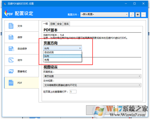 四、如果要對(duì)轉(zhuǎn)換的PDF格式文檔進(jìn)行更深的設(shè)置則可以點(diǎn)擊左邊最下面的“PDF”,進(jìn)入設(shè)置頁(yè)面后可以看到很多設(shè)置選項(xiàng),如頁(yè)面方向可設(shè)置為縱向或者自動(dòng)偵測(cè)布局等。