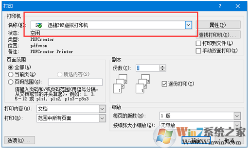 五、保存好設(shè)置后,啟動(dòng)Office,選擇任意格式的文檔,打開打印功能,在打印機(jī)選項(xiàng)的那一欄下拉,選擇“迅捷PDF虛擬打印機(jī)”(紅框所示),之后點(diǎn)擊右下角確定。