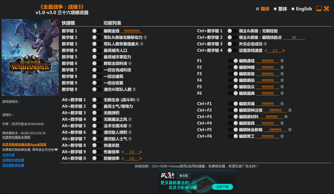 版本:1.0.0.16658全面戰(zhàn)爭:戰(zhàn)錘3 v1.0-v3.0 三十項修改器
