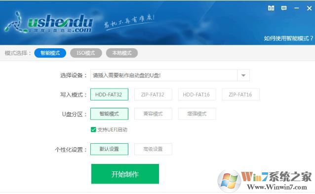 1、打開u深度u盤啟動盤制作工具,將準備好的u盤插入電腦usb接口,等待軟件自動識別所插入的u盤。隨后無需修改界面中任何選項,與下圖所示參數(shù)選項一致之后點擊“開始制作”即可: