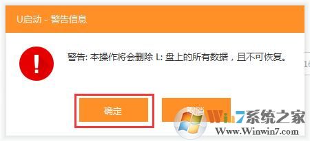 2、此時,彈出的警告窗口中告知會清除u盤上的所有數(shù)據(jù),請確認(rèn)u盤中數(shù)據(jù)是否另行備份,確認(rèn)完成后點擊“確定”: