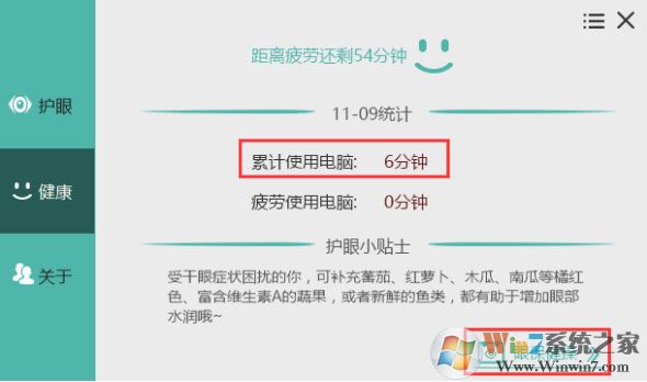 2、進入到護眼寶“健康”功能界面,在這個界面里我們可以看到累計使用電腦時間,及疲勞使用電腦時間長短。在這個界面的右下角還有緩解疲勞的眼保健操助我們緩解眼部疲勞。