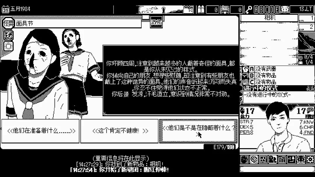 謎團探索中有概率遇到兩個事件,一個是吃飯一個是洗澡,具體大家自己探索吧(其實是我忘了具體效果),在探索中我們有概率會找到一個娃娃,這是影響結局的關鍵道具,結局事件中選擇獻祭娃娃會進入b結局,并且在謎團結束后得到一個+3最大理智+5毀滅的c槽裝備(有點雞肋)。