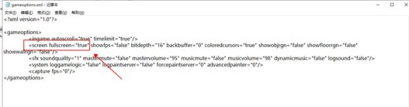 2、用記事本打開(kāi)gameoptions.xml,找到第四行中的“screen fullscreen=ture",將"ture"修改成"false"然后保存即可。