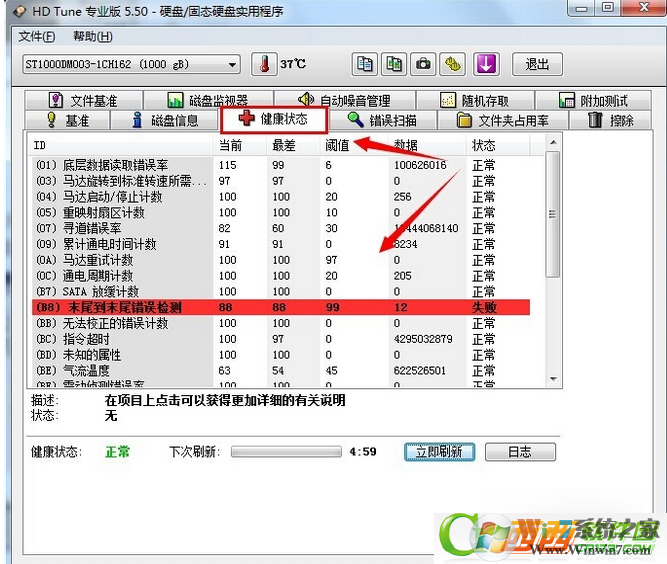 3、硬盤除了看有沒有壞道以外,需要看的是硬盤的健康狀態(tài),狀態(tài)下都是正常說明你的硬盤是好的。如果有出現(xiàn)失敗的狀態(tài)則需要保存好你的資料備更換硬盤哦