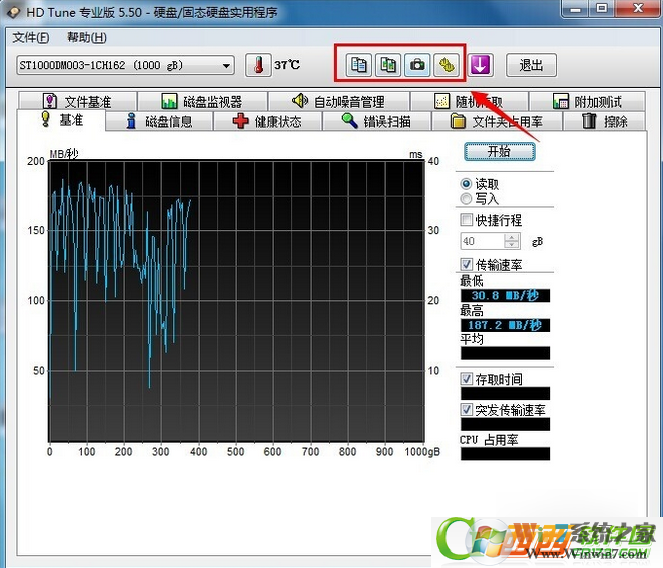 5、在HD Tune軟件的頂部有復(fù)制測試結(jié)果工具,還有為文軟件拍照的工具,HD Tune選項也是在這個位置